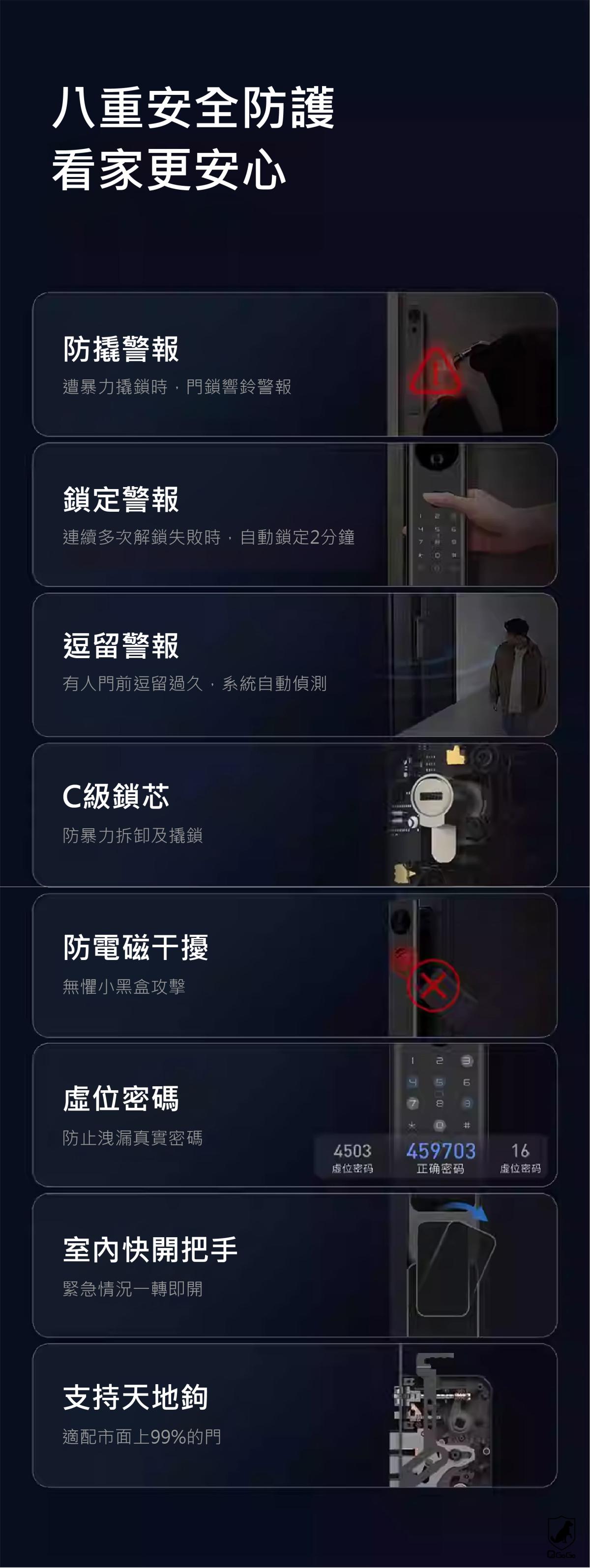 解鎖方式: 人臉、指紋、密碼、卡片、機械鑰匙、虛位密碼